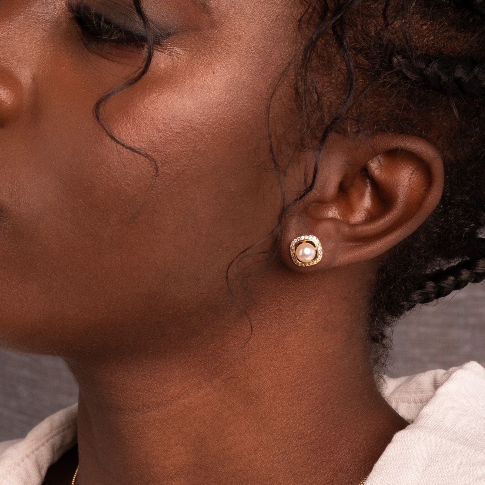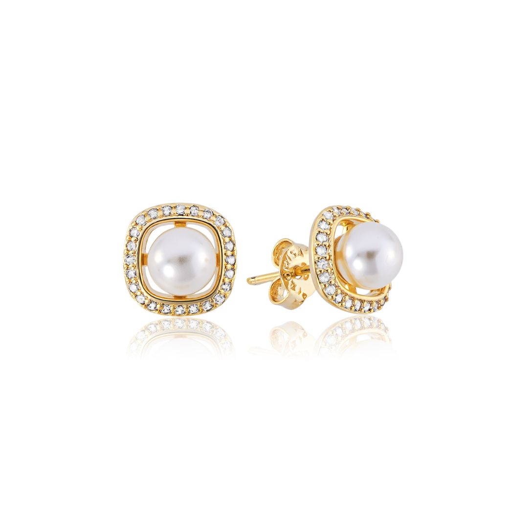 18K vergoldete Perlenohrringe mit quadratischen Zirkonia-Steinen