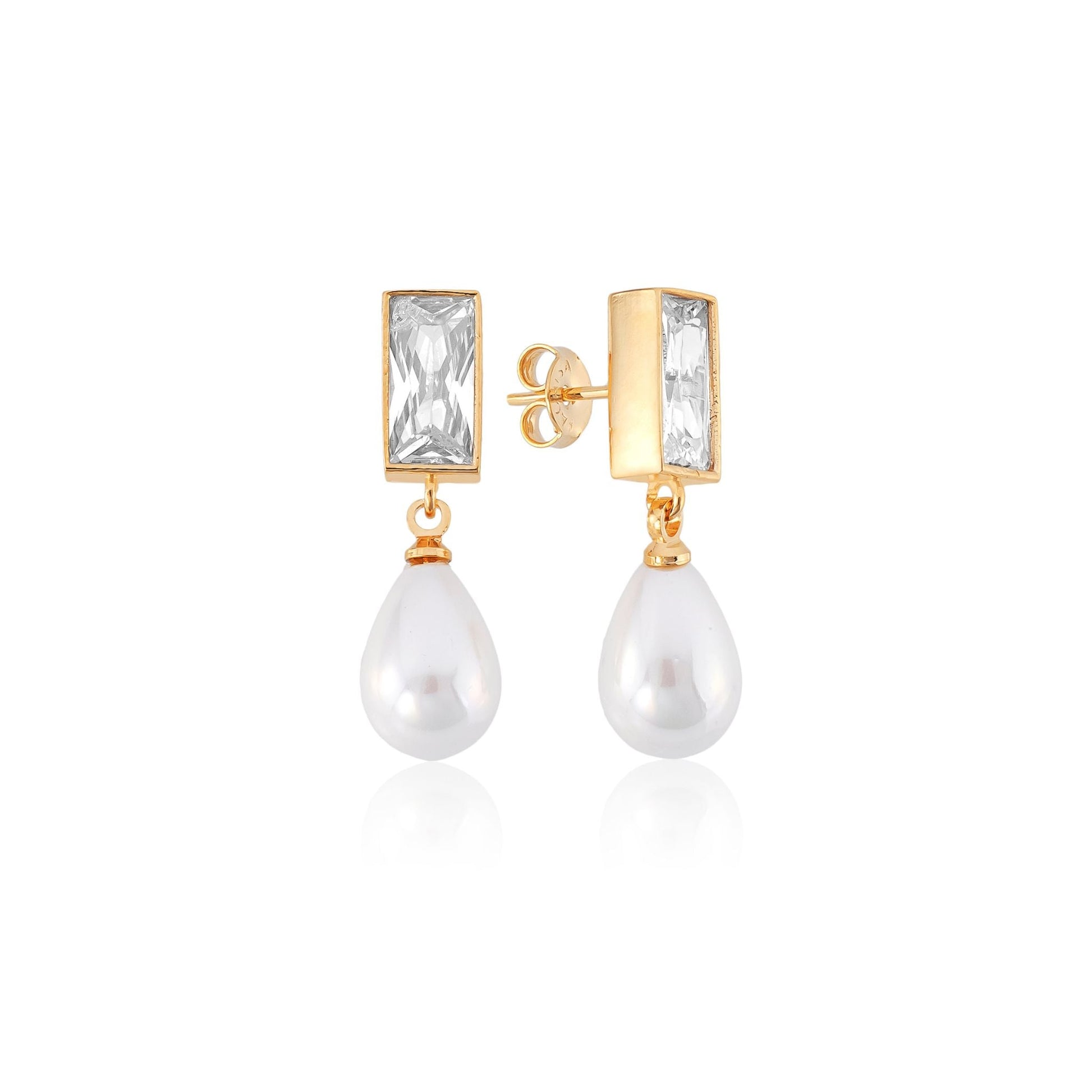 18K vergoldeter Tropfen-Ohrring mit Perle und rechteckigem Kristall
